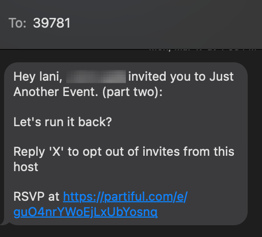 In many ways, Partiful is just the natural progression. Maybe even the first to tie your phone number to an invitation. But this ingenious idea might finally cross an important efficiency line in the sand. Unlike an old fashioned letter, flyer, phone call, or my beloved Facebook event - Partiful eliminates any space between my invitation and me. And through its automated pings and prods, it might just create more division between the actual host and me as that damn 39781 number arrives like a brick through the window.